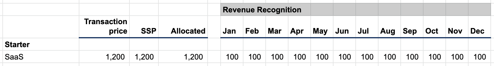 A customer signs up in January for Starter at $100/month billed annually (MarTech’s list price), and signs a one-year deal. In this case, we have a contract, one performance obligation which is to provide our SaaS for a year, and the transaction price of $1,200 ($100/mo * 12 months). Because we only have one performance obligation we allocate all of the revenue there. Revenue recognition is pretty straight forward for Starter: