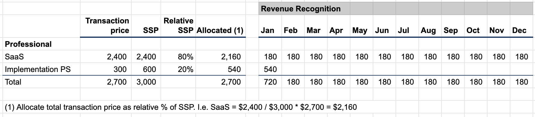 Allocating the total transaction price across the SaaS and implementation professional services results in $2,160 to recognize for SaaS, and $540 to recognize for implementation professional services. Notice this is different than what we sold, which was $2,400 for SaaS and $300 for implementation professional services.