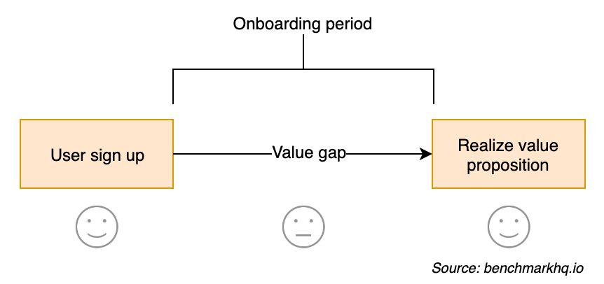 Time to value is the amount of time that passes between a customer signing up / buying your product and that customer realizing your product’s value proposition. This is typically represented by your onboarding period and is also called the value gap.