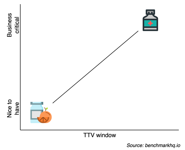If your product is business critical, you can afford a longer TTV window as the customer cannot run their business without your product. It’s a painkiller. Examples of this are ERP systems, billing systems, etc. These are systems where companies are willing to go through multi-quarter-long implementations as they can’t run their businesses without it.